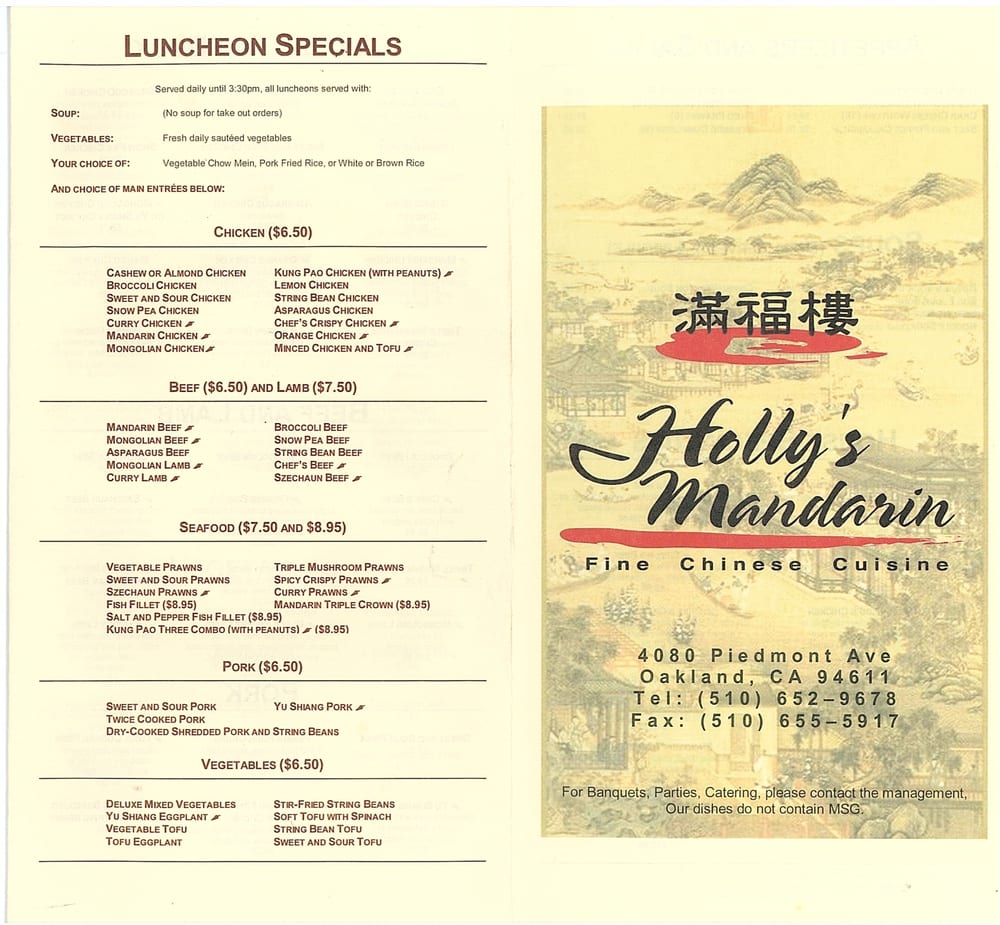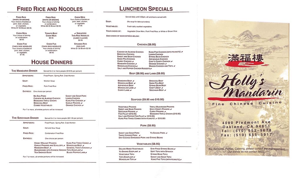 Introducing the menu at Holly’s Mandarin, a Chinese restaurant located on Piedmont Ave in Oakland, CA. This casual yet classy establishment offers a range of vegan and vegetarian options, as well as catering services for groups. Customer reviews rave about the Mongolian beef, combo fried rice, potstickers, salt and pepper chicken, chicken lettuce wraps, and wonton soup. The friendly service and quick turnaround for orders make it a popular spot for lunch or dinner. With easy parking options, wheelchair accessibility, and Wi-Fi available, Holly’s Mandarin is a go-to choice for delicious and satisfying Chinese cuisine.